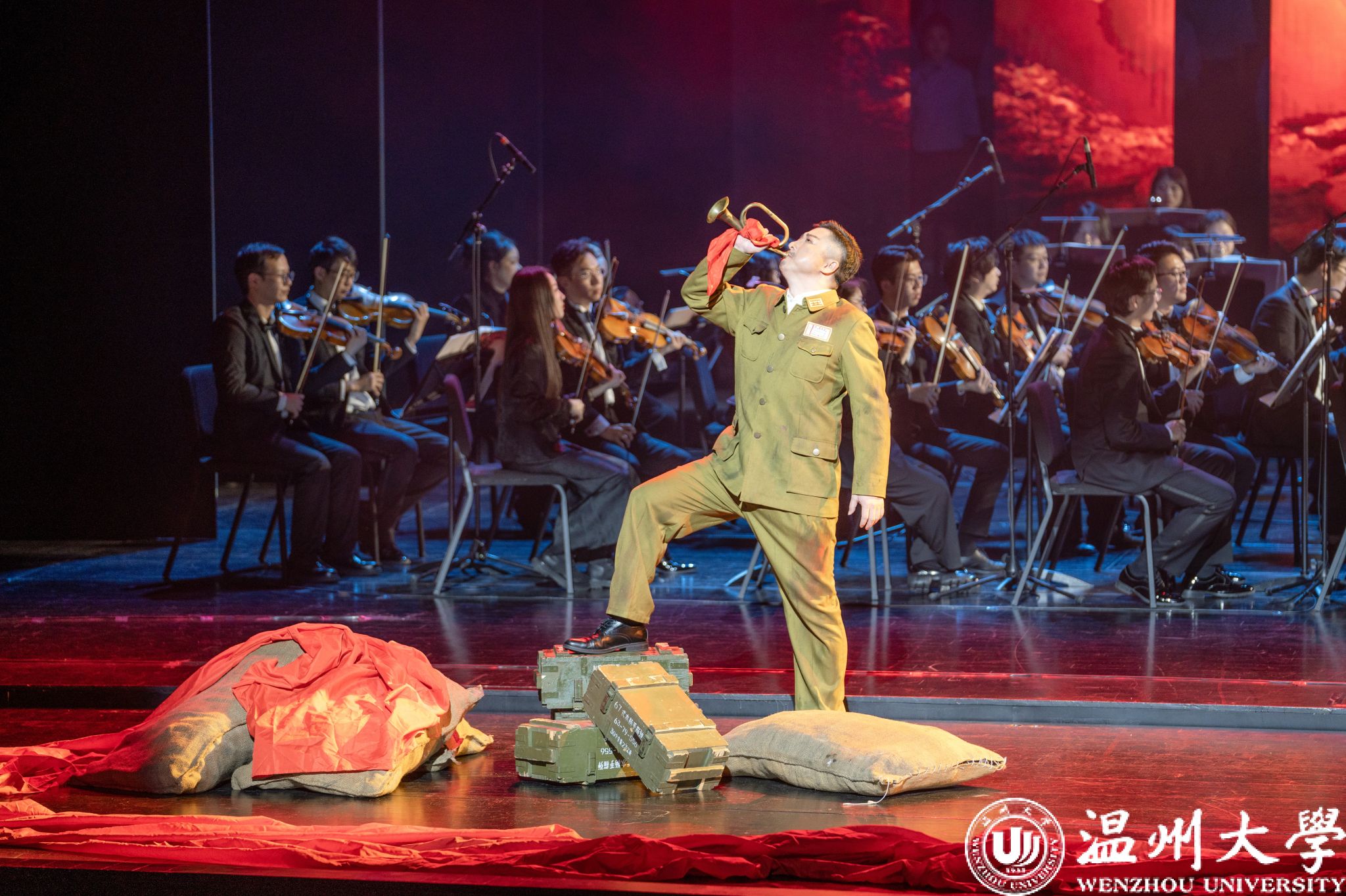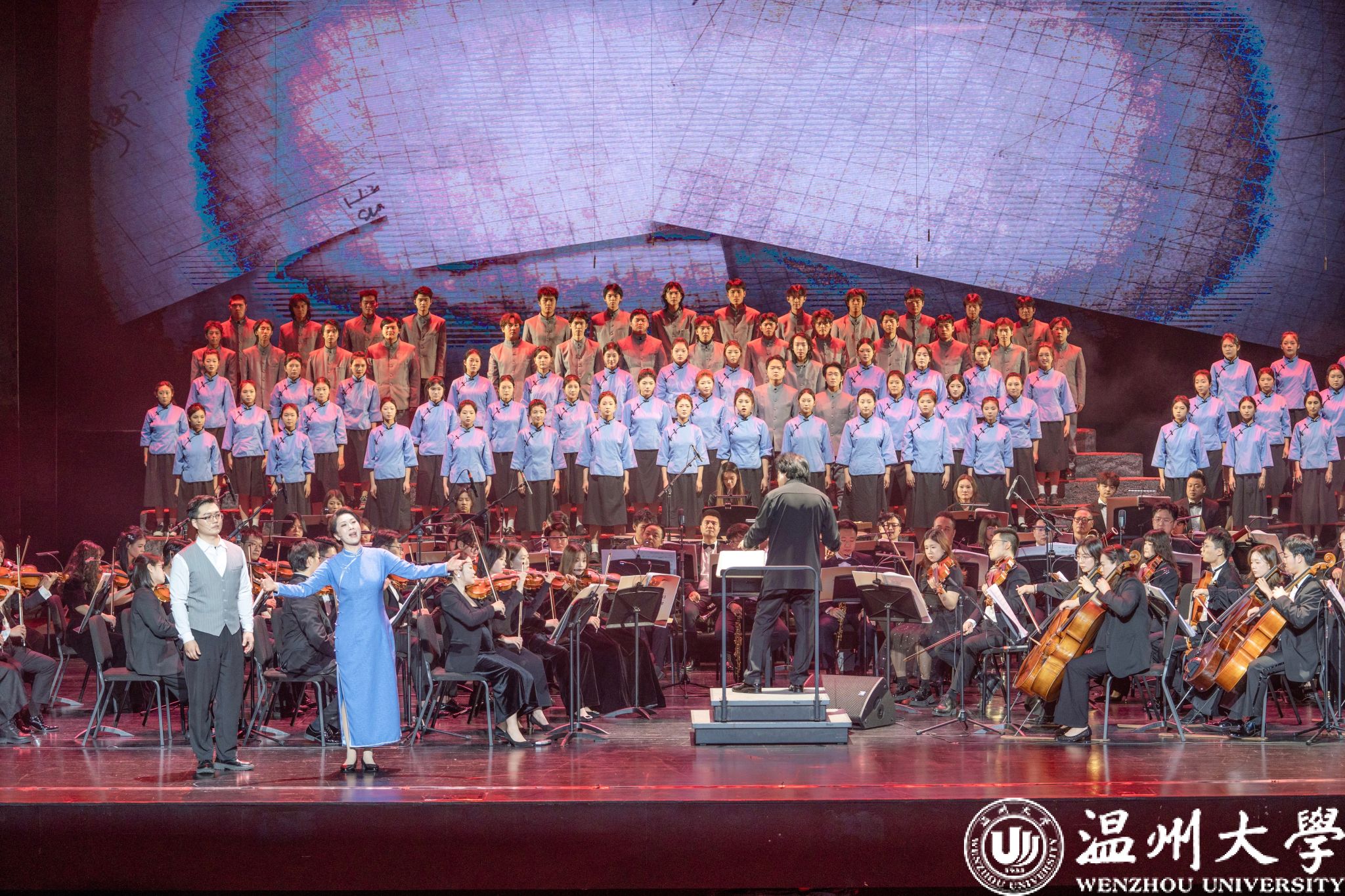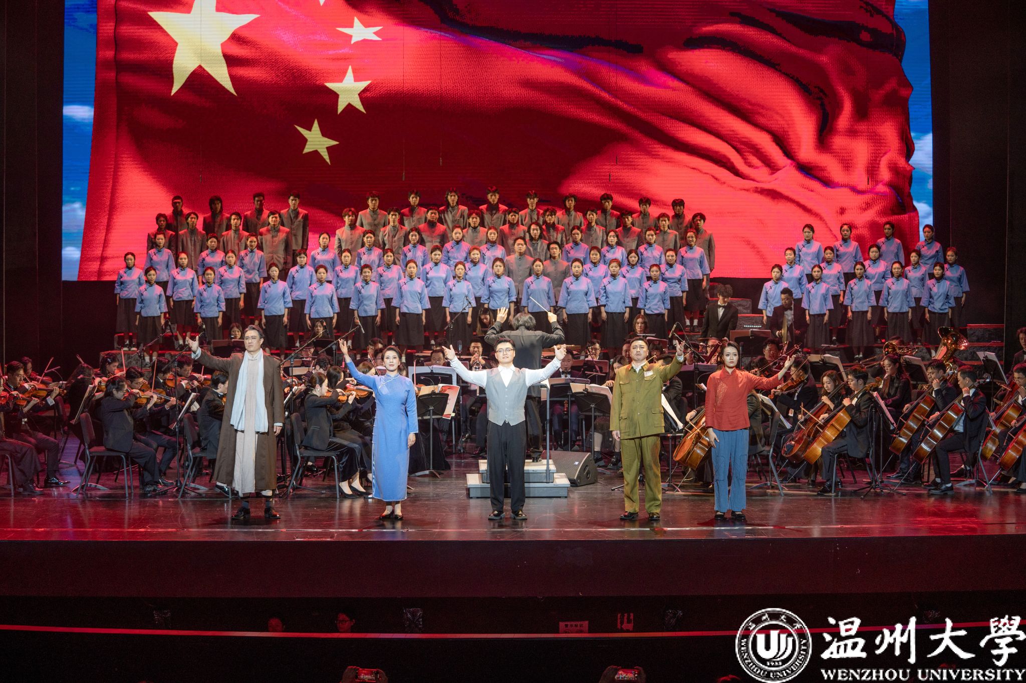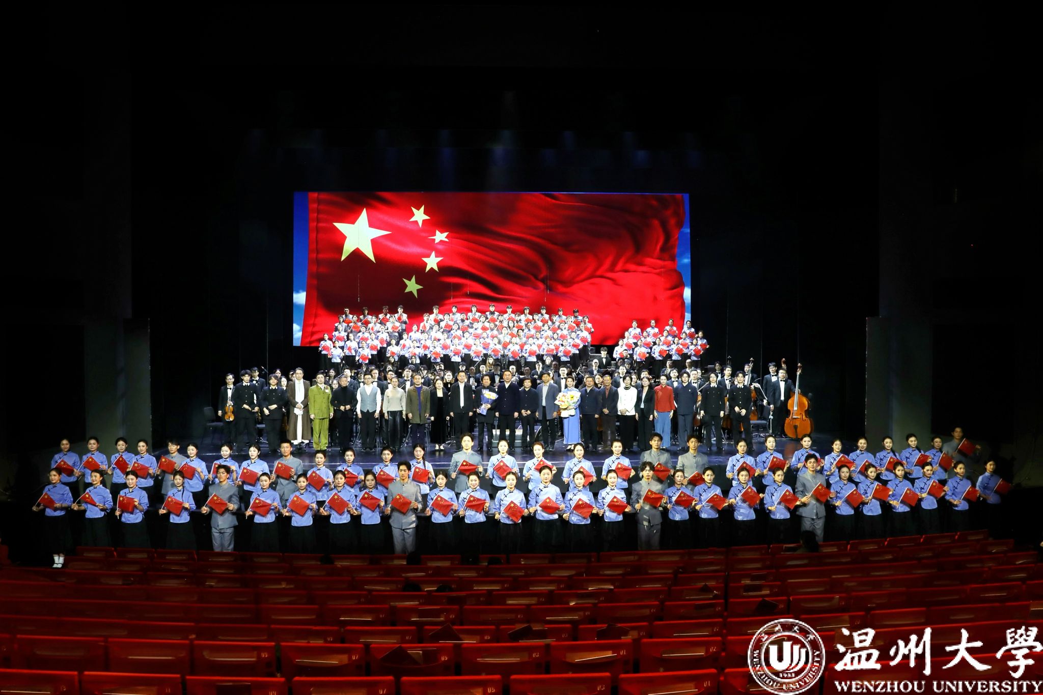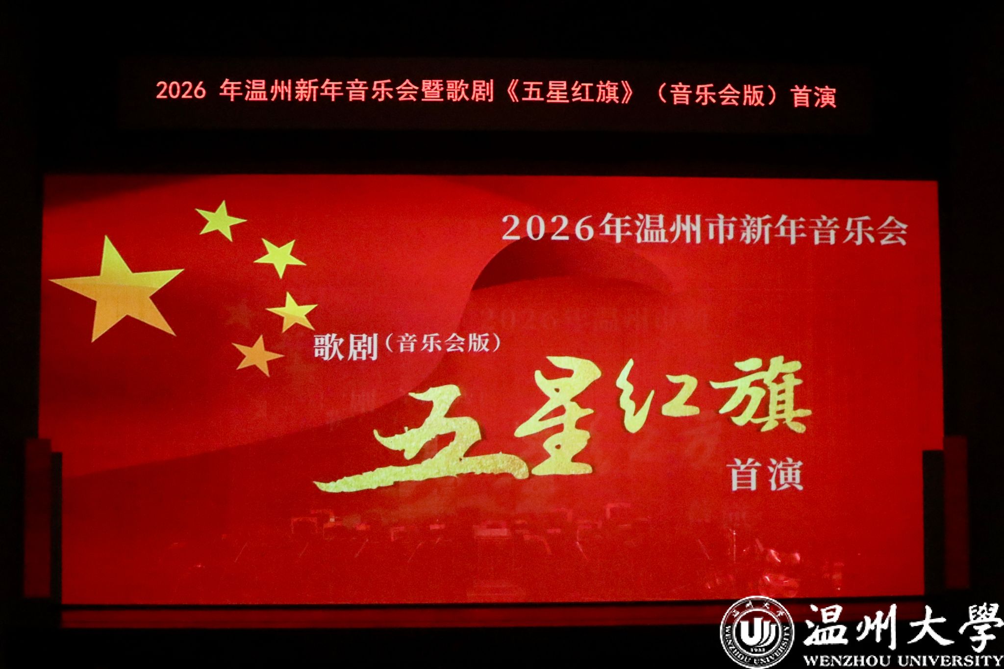 12月23日晚,温州大剧院歌剧厅内掌声不断,2026年温州新年音乐会暨温州本土原创歌剧《五星红旗》音乐会版首演在此温情启幕。本次演出由知名指挥家邹跃飞、叶熙熙执棒,温州大学师生倾情演绎,以音乐会版形式再现国旗设计者曾联松的动人故事,为市民朋友们献上了一场高水准的新年艺术盛宴。校领导钱强、庄兴忠、王尧骏、王展光观看演出。
